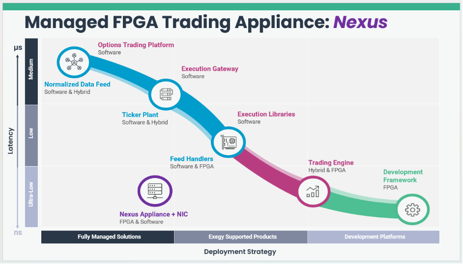 Laurent de Barry, recently promoted Chief Product Officer at Exegy, walked through the unveiling of Exegy Nexus, the FPGA-accelerated, managed appliance and NIC designed to eliminate the trade-off between speed and scale. Nexus centralizes feed handling, order book construction, and fan-out into a single, managed platform – reducing the infrastructure footprint while delivering nanosecond-level latency. He highlighted how Nexus supports multiple use cases:
